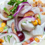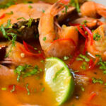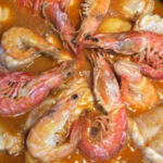 Fume de mariscos, aliños, hinojo, ron, camarones, calamares, mejillones