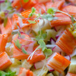 Lechuga, tomate, zanahoria, salmón ahumado, cangrejo, miel y mostaza